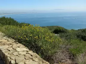 Bluff-top trail full of flowers in the spring. Lovely rugged beach and lagoon below.
