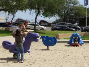 Park with plenty of benches in the shade, accessible playground with unusual equipment, tire swing, dome climby, wooden truck, dinosaur and dolphin bouncy, and plenty of swings.