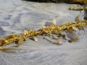 Rugged, windswept beach with large driftwood, kelp balls, and 1.5km wooden boardwalk.