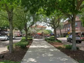 Main strip of West Palm Beach, with colorful and inviting architecture and decorations.