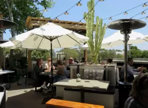 Upscale, colorful plaza in farmhouse style, with modern cafes. Kids climb on a huge log. The fire pit is fantastic at night, surrounded by eucalyptus trees.