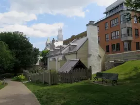 Enchanting little park with leafy trees, stone walls, old French architecture, and a picket fence, where you can have a picnic.