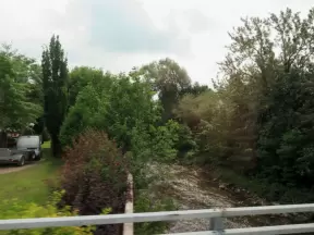 Nice little main street, with cafes, pretty storefronts, park, swinging bridge over a creek with tropical vegetation, and neighborhood with white picket fences and gardens.