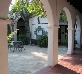 A pedestrian-only area on State Street with sidewalk cafes, good shopping, and colorful Spanish architecture.