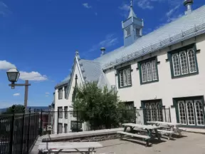 Enchanting little park with leafy trees, stone walls, old French architecture, and a picket fence, where you can have a picnic.