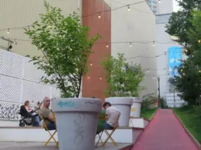 Trendy area with coffee shop, beer garden, wine bars, and cider bar, in industrial-style architecture with murals.