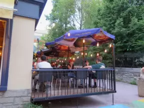 Trendy area with coffee shop, beer garden, wine bars, and cider bar, in industrial-style architecture with murals.