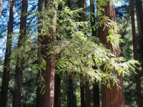 A redwood forest that looks like Northern California, with a playground and spacious knolly lawn.