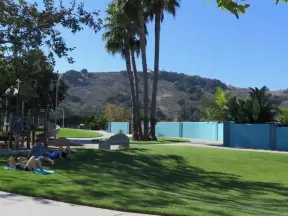 A huge green lawn looking out over the bright blue ocean and Leadbetter Beach.