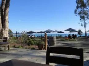 Upscale, colorful plaza in farmhouse style, with modern cafes. Kids climb on a huge log. The fire pit is fantastic at night, surrounded by eucalyptus trees.
