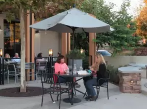 Upscale, colorful plaza in farmhouse style, with modern cafes. Kids climb on a huge log. The fire pit is fantastic at night, surrounded by eucalyptus trees.