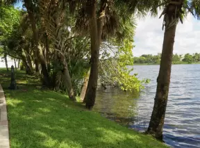 Pretty park along the intracoastal waterway near high rises, with walking paths, playground, gazebos, fountain, and tennis courts.