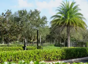 Tropical park with sky-high playground for older kids, toddler playground, fitness trail and stations, pale-lime gazebo, and spiffy basketball courts.