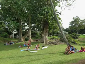 Huge park in Waikiki across from the beach where groups gather to play ball and fly kites.