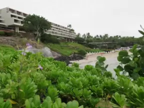 A beach with island views, in front of the Fairmont Kea Lani, with a sand embankment where there is morning shade from a highrise.