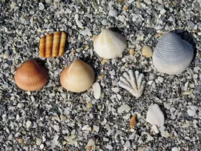 Wide-open beach with pale grey sand, shells on the shore, and aquamarine water, across from a playground, turtle center, and hike.