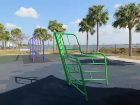 Waterfront park with amazing colors in the water- views of an island and blue-green sandbars. Plenty of benches and docks, and a playground.