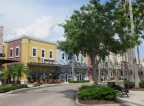 Outdoor mall with movie theater, cafes with atmosphere, candy shop, and more.
