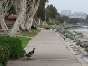 Cement ship playground with logs to climb, seal, dolphin, whale's tail and giant octopus sculptures, picnic tables, and an amazing view of Morro Rock and the inlet.