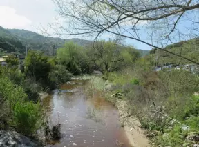 A lovely park of rolling green hills and gnarled oak trees, with a creek, and a new playground with boulders and ropes.