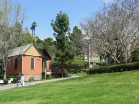 Large lush park with tall tropical trees, attractive bandstand, cute toddler playground, historic house and schoolhouse, swinging bridge to the main street, and neighborhood with cottages.