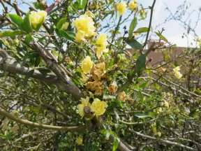 Spanish mission from late 18th century, in downtown San Luis Obispo, with giant roses in the garden behind and a lively plaza in front.
