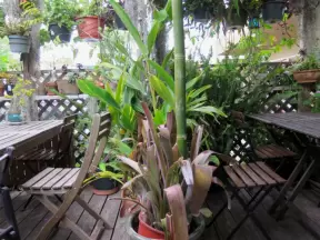 Colorful plantation-style house with courtyard full of tropical palms and orchids, lovely architecture, and lagoon with giant banyan tree.
