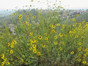 Bluff-top trail full of flowers in the spring. Lovely rugged beach and lagoon below.
