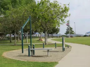 Wide open park behind the dunes in Morro Bay, with play structure with sand floor, and huge lawn with winding paths for tricycling.