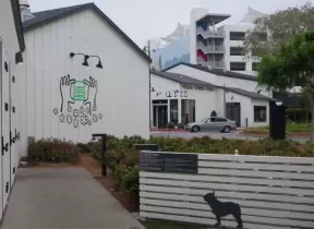 Upscale, colorful plaza in farmhouse style, with modern cafes. Kids climb on a huge log. The fire pit is fantastic at night, surrounded by eucalyptus trees.