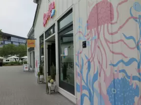 Upscale, colorful plaza in farmhouse style, with modern cafes. Kids climb on a huge log. The fire pit is fantastic at night, surrounded by eucalyptus trees.