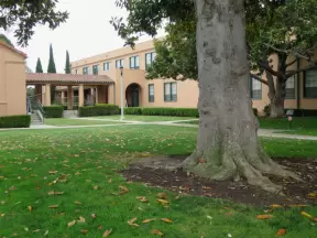 Restaurants with magical gardens, shops, fountain, open grassy areas, historical salmon-pink Spanish Revival architecture at a former naval training center.