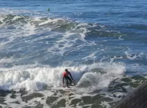 Gorgeous spot with wide pier, surfers carving the waves, whale playground, wide open attractive plaza, Pismo Beach selfie sign, and wooden promenade with views of the hills and sea.