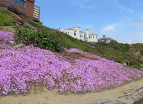 Wealthy neighborhood with cliffs covered in wildflowers above the turquoise sea.