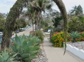 Adorable houses with gardens full of flowers, and streets leading down to lookout points over the ocean.