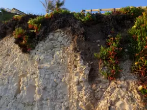 A great place to picnic or marry, with sea caves and jutting sea rocks below cliffs of hanging flowers.
