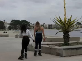 Boardwalk along a fairly grotty beach, where people rollerblade and stroll together.