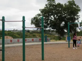 Large field with sweeping views, playgrounds, workout stations, picnic pavilions, and walking path around the field.