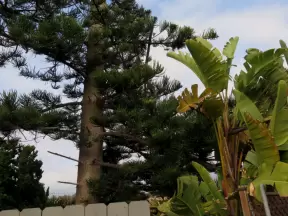 A green sloped lawn with huge, healthy pines that shade you, picnic areas with hanging vines, and a toddler playground.