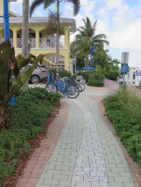 A cement bike and walking path along the intercoastal waterway in front of mansions and past glorious trees.