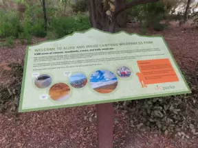 Popular 1.7 mile loop walking path with some shade and wooden boardwalk beside the river.
