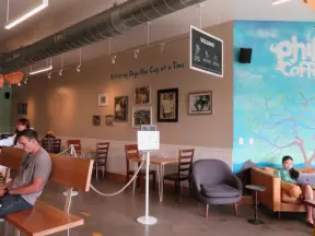 Restaurants with magical gardens, shops, fountain, open grassy areas, historical salmon-pink Spanish Revival architecture at a former naval training center.