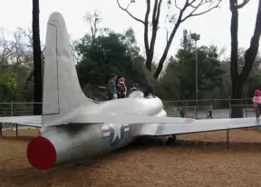 A fantastic park a jet plane, fire engine, and train to climb! Carousel, railroad rides, summertime paddle boat rides, walkway along a gorgeous creek, amazing tall pines, two play structures, and geese!