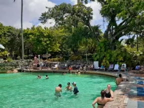 Unique spring-fed historical pool with Venetian-style buildings, bridge, striped posts, waterfall, caves, palms, and banyan tree. Glorious!