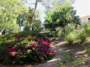A peaceful 3-mile walk through oaky forest, past lush landscaping and a park with a historic adobe house, and among a neighborhood with gardens filled with flowers.