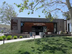 Upscale, colorful plaza in farmhouse style, with modern cafes. Kids climb on a huge log. The fire pit is fantastic at night, surrounded by eucalyptus trees.