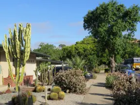A peaceful 3-mile walk through oaky forest, past lush landscaping and a park with a historic adobe house, and among a neighborhood with gardens filled with flowers.