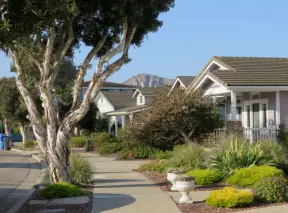 Narrow tree-lined streets in the Anholm District with historic houses and views of Madonna Mountain and Bishop Peak, and a sweet deli.