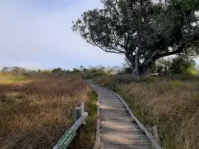 A magical clear pond with tadpoles and ducks, healthy eucalyptus trees with big leaves, winding salt marsh, and boardwalk.