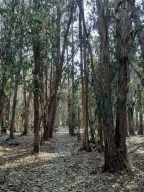 Shady walk among eucalyptus trees. Peaceful! Plus a cute playground tucked in a corner at the end.